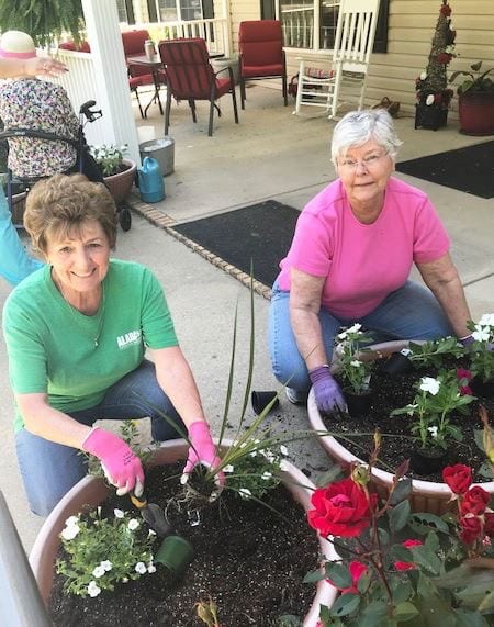 The Gardens of Clanton Assisted Living facility approached two Chilton County Master Gardeners for advice and assistance on planting annual pots for the entrance and front porch and an existing vegetable bed and pots on the back patio. The Gardens obtained donations of annuals, vegetables, and herbs and provided potting mix and pine straw. The entrance pots were planted with vinca, calibrachoa (million bells) and ornamental grass. Tomatoes, yellow squash, bell peppers and sweet banana peppers, radishes and basil were planted in the existing 8×8 vegetable bed after it was weeded and amended with compost. An herb pot with flat leaf parsley, oregano, thyme, chives, basil and garden sage was added to the patio along with pots of rosemary, lemon balm and chocolate mint. Other pots on the patio hold cherry tomatoes and vinca for a pop of color. The vegetables and herbs will be used in preparing the residents’ meals and the herbs can be also be enjoyed just for their scents.