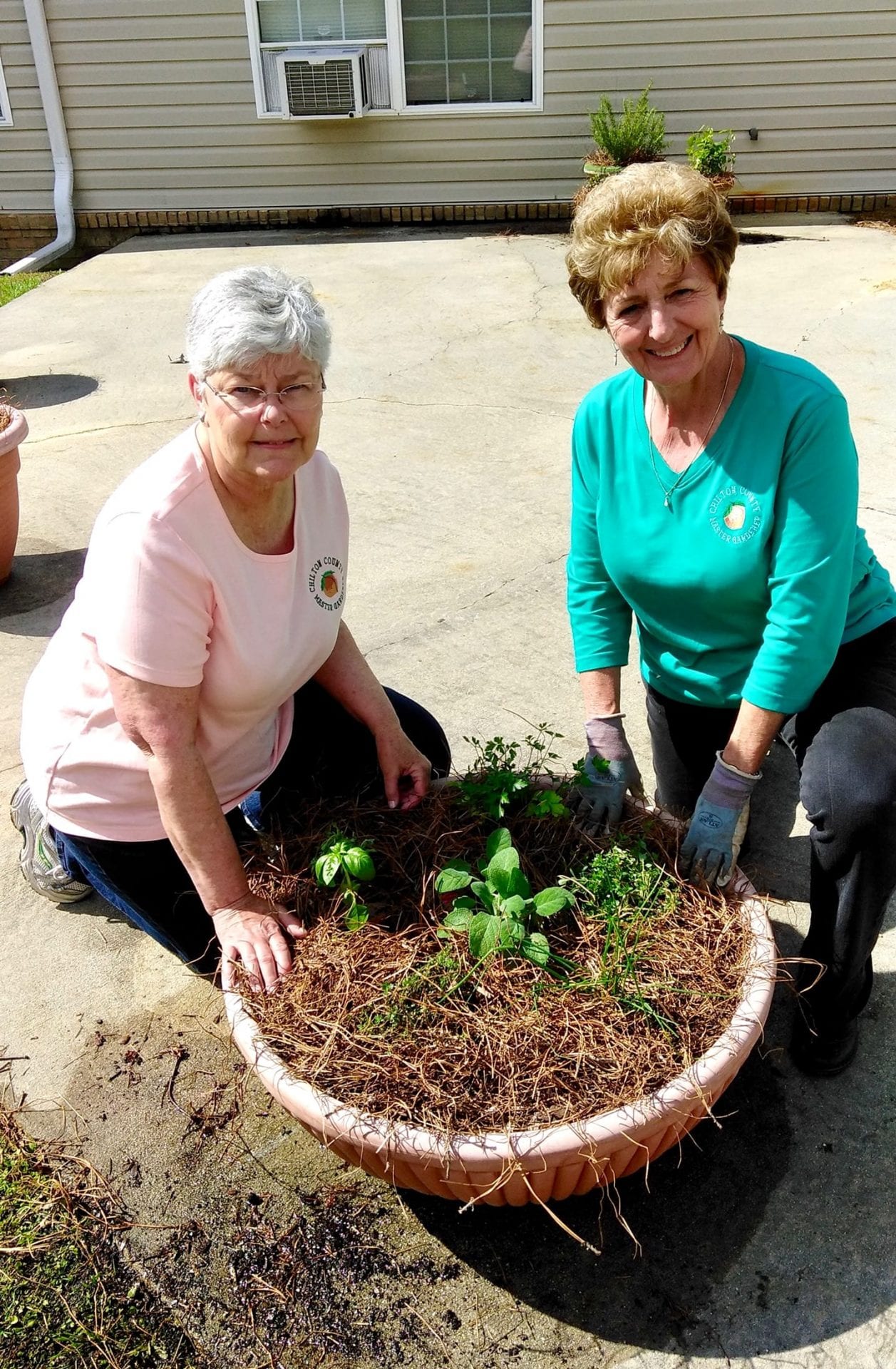 The Gardens of Clanton Assisted Living facility approached two Chilton County Master Gardeners for advice and assistance on planting annual pots for the entrance and front porch and an existing vegetable bed and pots on the back patio. The Gardens obtained donations of annuals, vegetables, and herbs and provided potting mix and pine straw. The entrance pots were planted with vinca, calibrachoa (million bells) and ornamental grass. Tomatoes, yellow squash, bell peppers and sweet banana peppers, radishes and basil were planted in the existing 8×8 vegetable bed after it was weeded and amended with compost. An herb pot with flat leaf parsley, oregano, thyme, chives, basil and garden sage was added to the patio along with pots of rosemary, lemon balm and chocolate mint. Other pots on the patio hold cherry tomatoes and vinca for a pop of color. The vegetables and herbs will be used in preparing the residents’ meals and the herbs can be also be enjoyed just for their scents.
